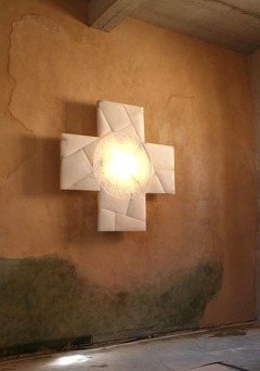 Geheimnisvoll wirkt das Kreuz an seinem neuen Platz in der Kapelle der Heldburg. Hier habe ich eine besondere Eigenschaft des Alabasters genutzt, die Lichtdurchlässigkeit. Als Kind habe ich mit meinen Eltern, in Ravenna, das Mausoleum der Galla Placidia angeschaut. Sie war die Tochter des römischen Kaisers. In dieser kleinen Kirche, die 425 - 430 erbaut wurde, sind als Fenster Alabasterscheiben eingesetzt, die ein warmes Licht in den Innenraum schicken und die wunderbaren Mosaiken in ein ganz besonders Licht tauchen. Daran habe ich mich erinnert bei der Planung für das Heldburger Kreuz. Gleichzeitig wollte ich an diesem Ort ein Symbol, das für alle Menschen wirkt und der wechselvollen Geschichte dieses Ortes entspricht. Licht als Zeichen für Gott, auch im nicht personalen Sinn, hat eine Bedeutung in allen großen spirituellen Traditionen der Welt. Licht im Zentrum eines gleichschenkligen Kreuzes ist für alle Menschen lesbar, ein Archetypus.