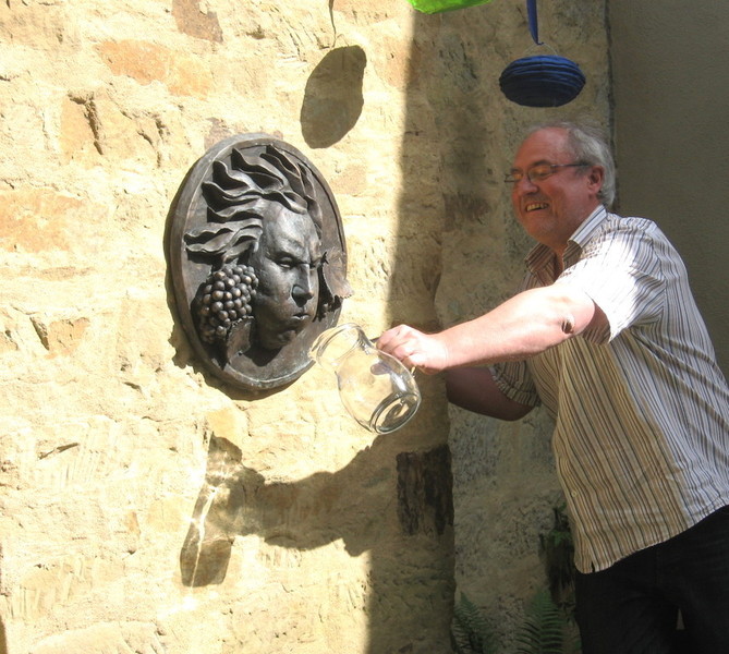 Franz hatte den Wunsch etwas italienische Stimmung in seinen Garten zu bringen. Ich habe sein Gesicht zur Fratze eines Weingottes geformt und in Bronze gegossen. Bei besonderen Festen kann man auch einmal Wein aus dem Brunnen zapfen.